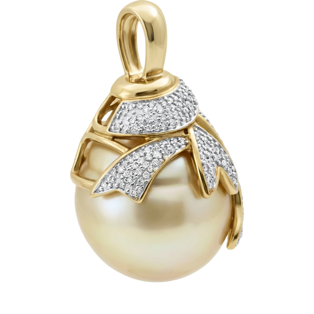 Capture hearts with this enchanting 9ct golden pendant, where lustrous South Sea pearls meet sparkling diamonds in a whimsical heart design.