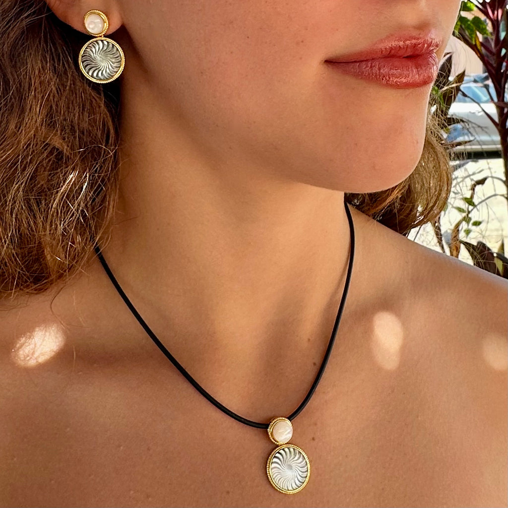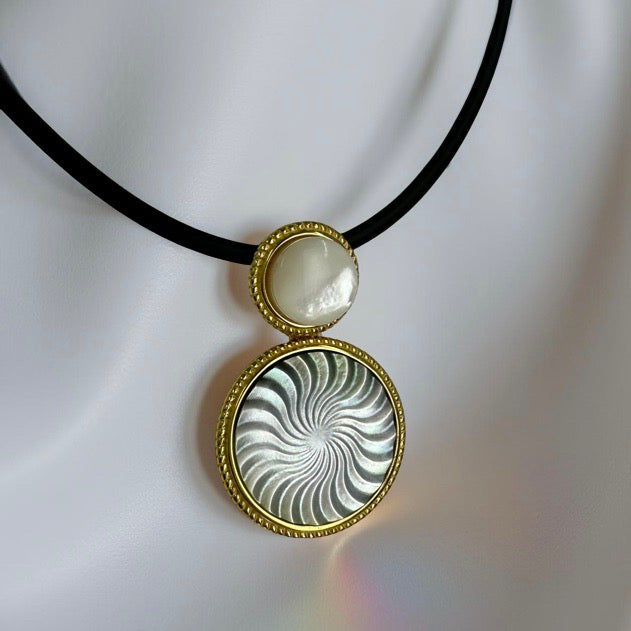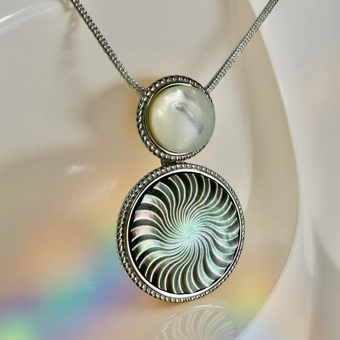 This Pendant showcases a three-dimensional spiral design that beautifully captures and reflects the natural iridescence of Tahitian mother of pearl. Crafted with precision, the pendant features a Pinctada mother of pearl accent at the top, reminiscent of the moon’s serene glow.