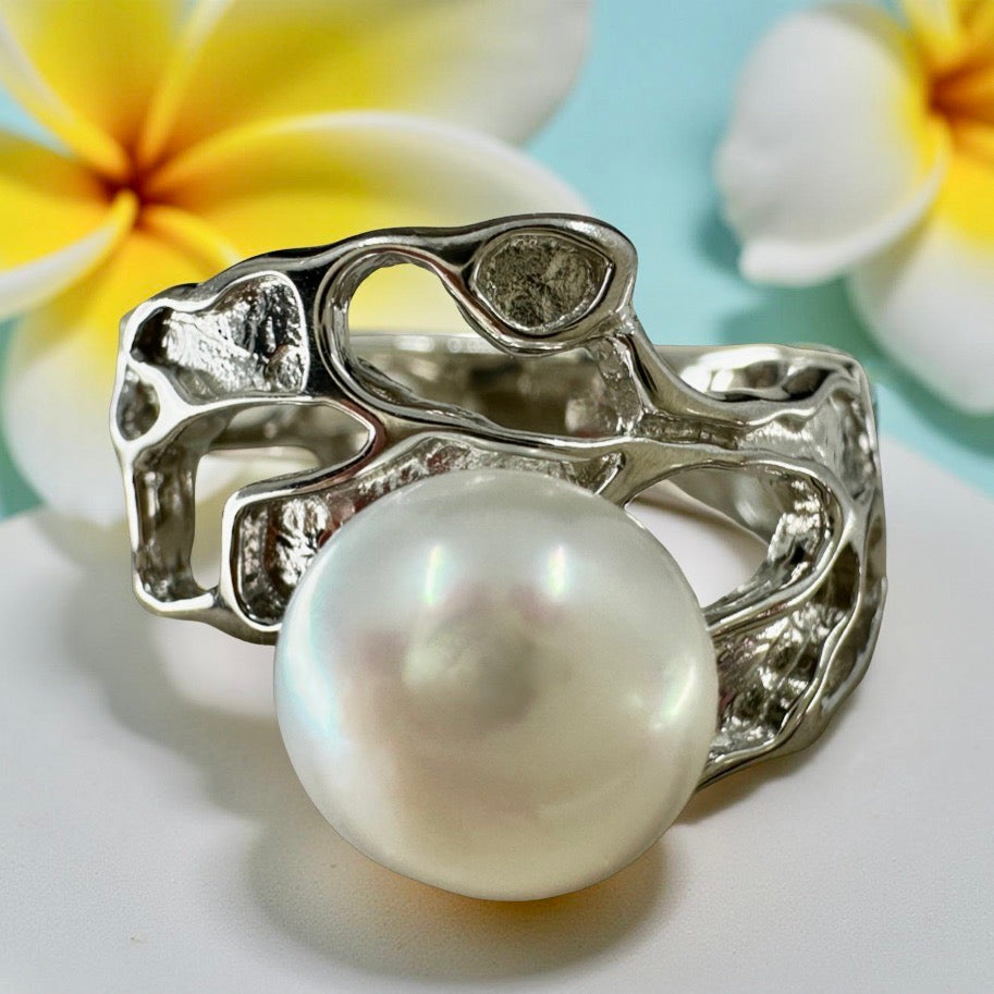 Expertly crafted from sterling silver, this unique ring features a cultured freshwater pearl encircled by intricate seaweed-inspired details.