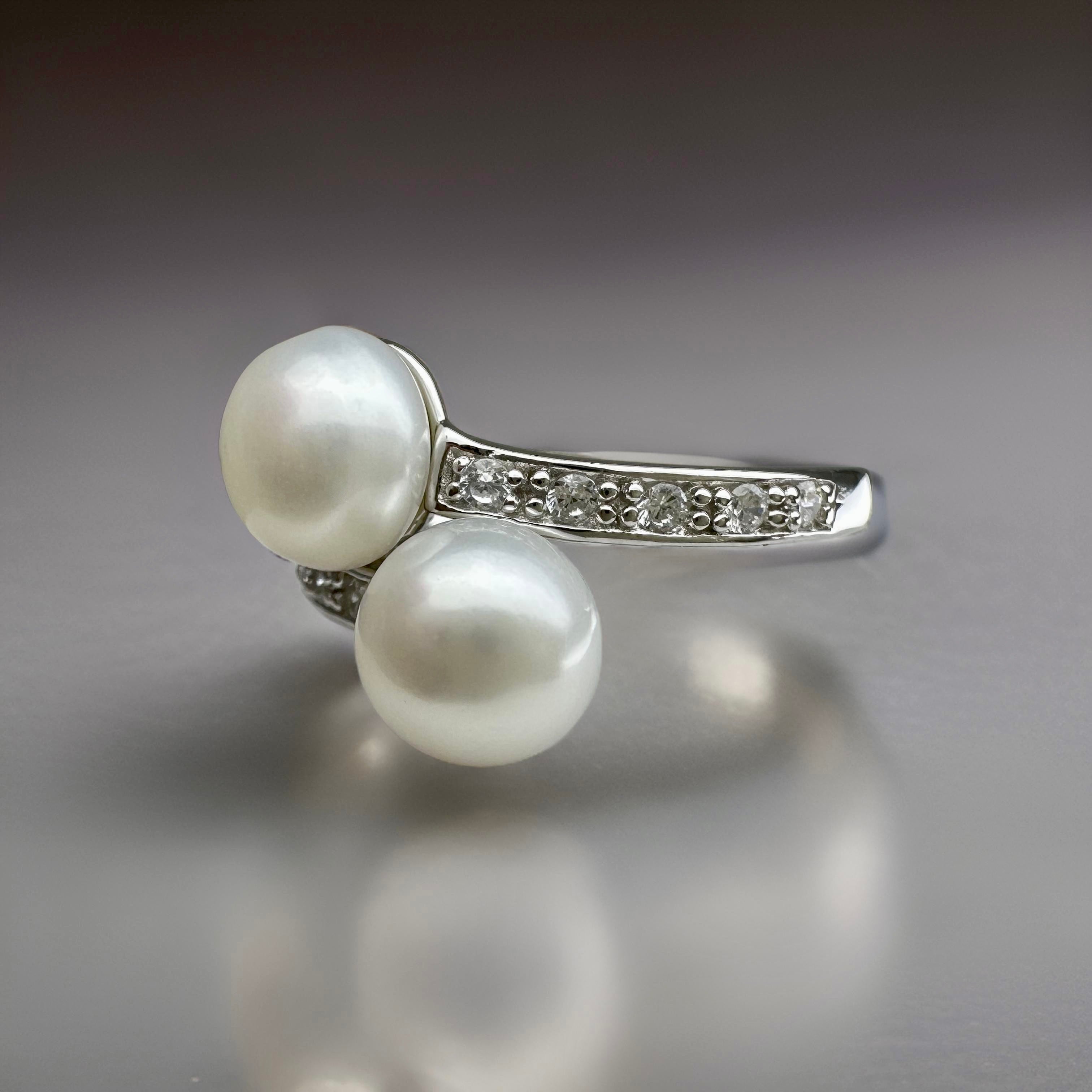 Our Cubic Zirconia Silver Ring features a stunning double pearl design, accented with sparkling pave set cubic zirconias on a sterling silver band.